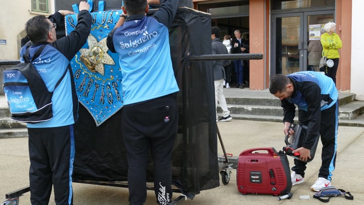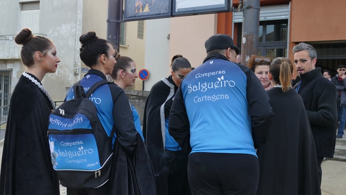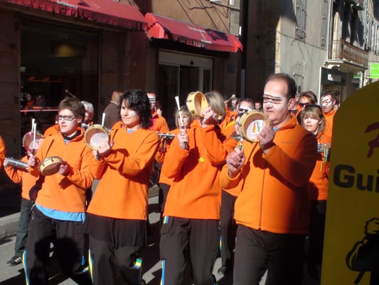 Le cortège est ouvert par la bande dont c’est le jour de sortie. Ses membres, appelés "fecos", dansent lentement en en agitant un roseau recouvert de rubans appelé "carabène" et en jetant des confettis dans la foule. Parfois, bien que cela soit plus rare aujourd’hui, certains danseurs s’approchent de membres du public qu’ils connaissent pour leur prononcer à l’oreille quelques mots en occitan, on appelle cela la "chine".