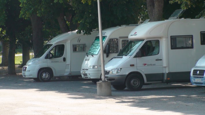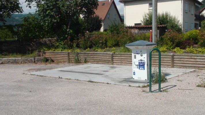 La borne de services et l'immense aire de stationnement se situe derrière la pharmacie à côté de la salle des fêtes (attention les soirs de mariage)...