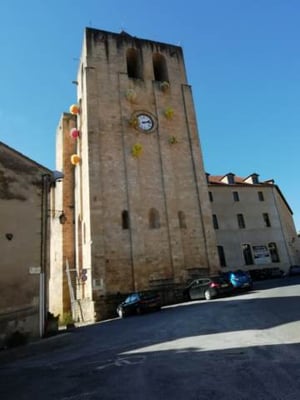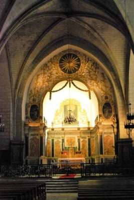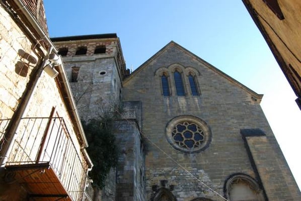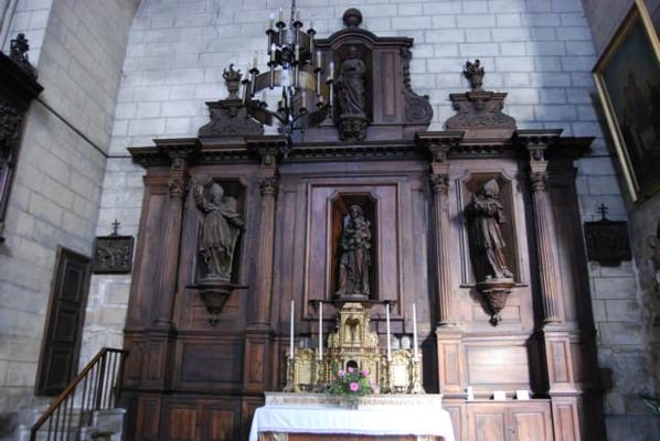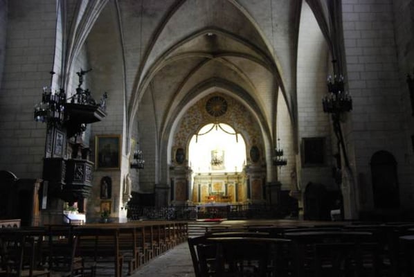xiiie et xive siècles, avec son clocher-donjon, réputée pour ses qualités acoustiques, classée monument historique en 192319. Une grande partie de son remarquable mobilier intérieur des xviie et xviiie siècles : buffet d'orgue20, maîtres-autels et leurs statues en bois polychrome, stalles23, chaire, est classé monument historique. Le clocher se visite pendant les Journées du Patrimoine. Les quatre vitraux de la façade sud ont été réalisés en 1965 par Henri Guérin, peintre et verrier (1929 – 2009) dans un style contemporain (verre teinté et béton armé).