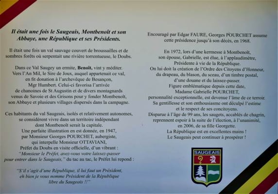 Montbenoît, il n’en est pas moins vrai que cette micronation a pour ancrage un territoire de 128 km2 et une histoire issue de l’époque médiévale. Composée de tout ou partie de 11 villages du Haut-Doubs, dotée de deux capitales, Gilley pour l’économie et Montbenoît pour la politique, abritant l’un des plus beaux sites du Moyen-Age de France, la République du Saugeais joue un rôle important dans la représentativité régionale.