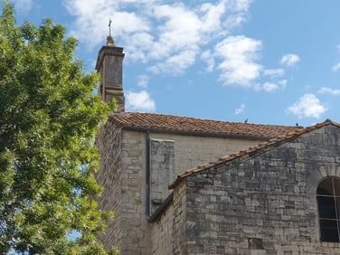 Un cordon de losanges est dessiné à l’extérieur de l’église. On retrouve ce même ruban sur le Porche de la Cathédrale d’Alès et sur la façade des maisons romanes de Vézenobres.