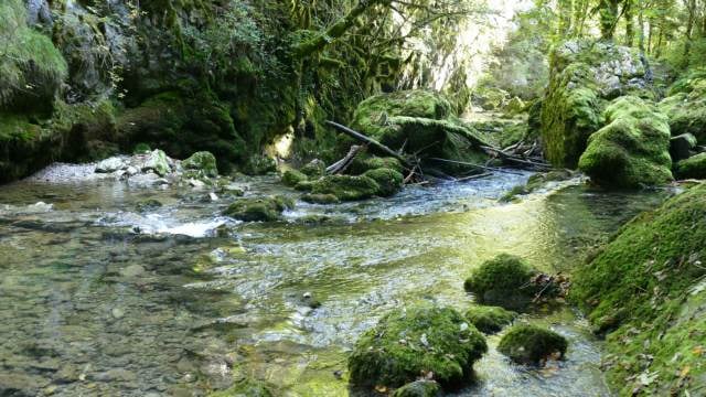 Cette petite balade de 2 km permet de découvrir l'un des plus beaux sites du Jura, les Gorges de l'Abime. Au pied du Cirque de Vaucluse, ce sentier de découverte, entièrement aménagé, permet de parcourir les étroites gorges dessinées par le torrent tumultueux de l'Abime. A l'aide de passerelles pour être au plus près des eaux vives, vous enjamberez les marmites de géants avant de rejoindre l'une des sources de ce torrent, la plus spectaculaire, le trou de l'abime, puits noyé de 45m de profondeur, et ses eaux turquoises...