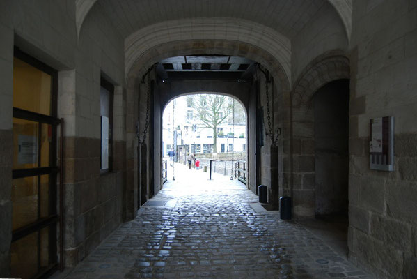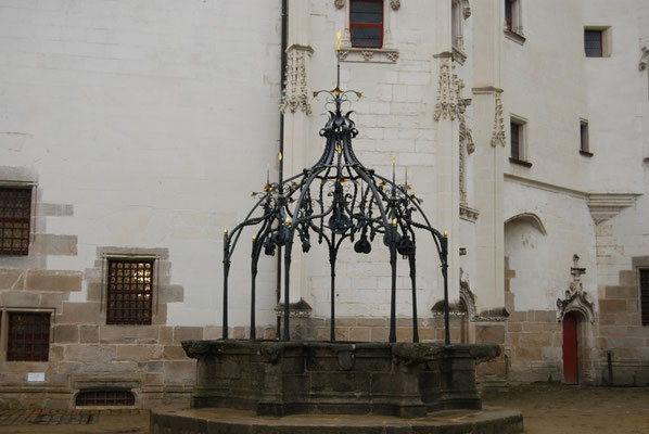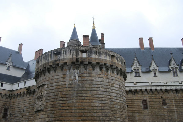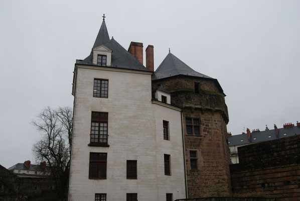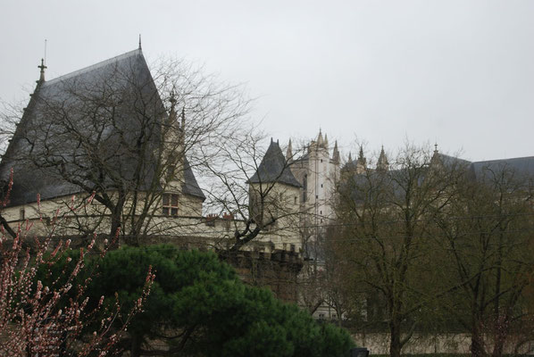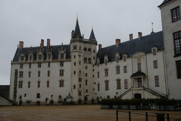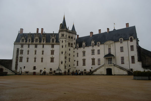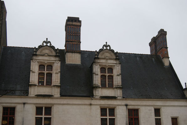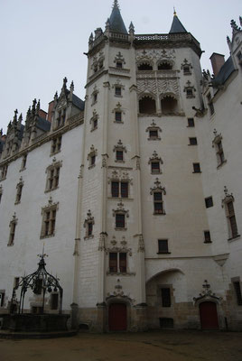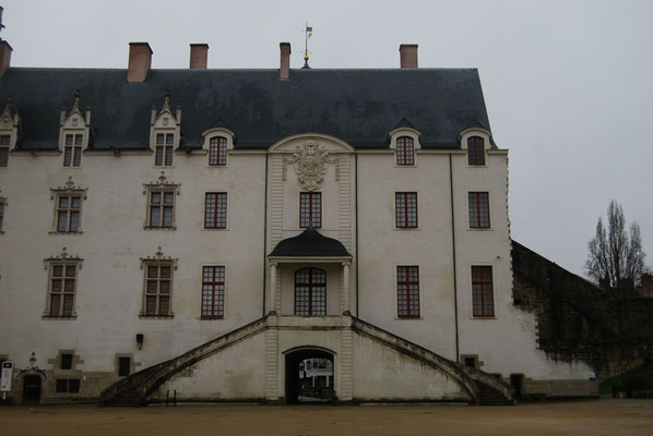 Côté cour, il abrite une élégante résidence ducale du 15e siècle en pierre de tuffeau, de style gothique flamboyant portant les premières marques d’inspiration Renaissance, et d’autres bâtiments datant du 16e et du 18e siècles. Ceux-ci contrastent par leur blancheur et leur raffinement sculpté, avec la rudesse des murailles extérieures en blocs de granit séparés par des assises de schiste