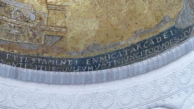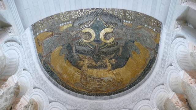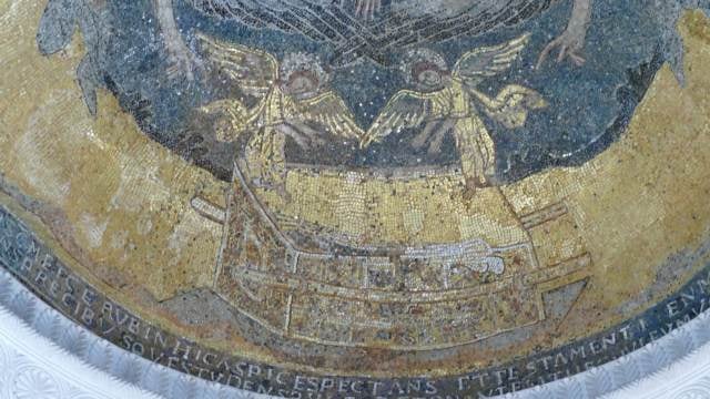 On raconte que ce sont des enfants du village qui ont permis de retrouver la mosaïque : ils jouaient avec des « cubes de verre » trouvés dans l’église. Imaginez la surprise des archéologues lorsque, sous le badigeon, ils ont mis à jour une mosaïque datant du 9ème siècle. Au moment de cette découverte, nous sommes au 19ème, l’église est alors classée, restaurée, reconstruite en partie. C’est l’une des plus anciennes de France.
