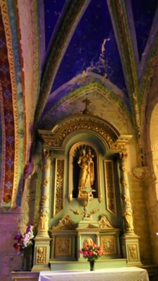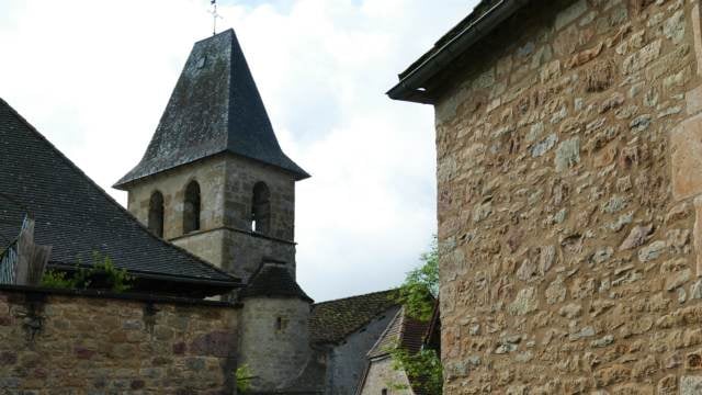 Emergeant au-dessus des arbres, les toits de Loubressac tutoient l’azur du ciel en une partition toute en demi-teintes. Un peu de brun, une touche d’ocre, un trait de miel… et là, centrée comme un point d’orge, l’ardoise du clocher de l’église des XII et XVIème siècles.