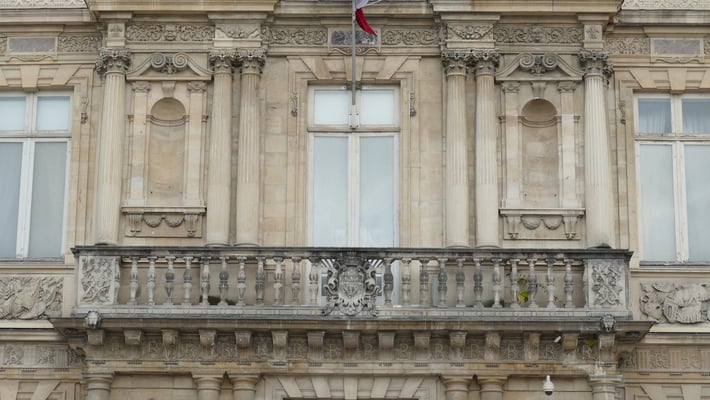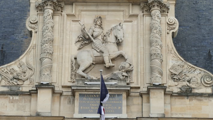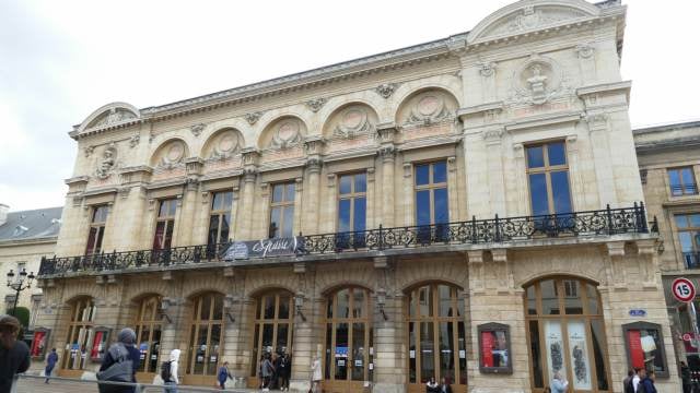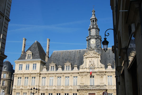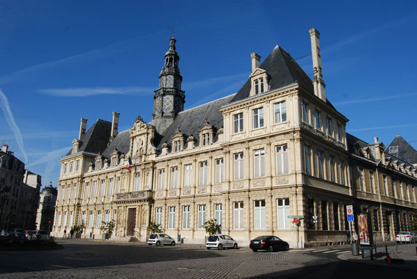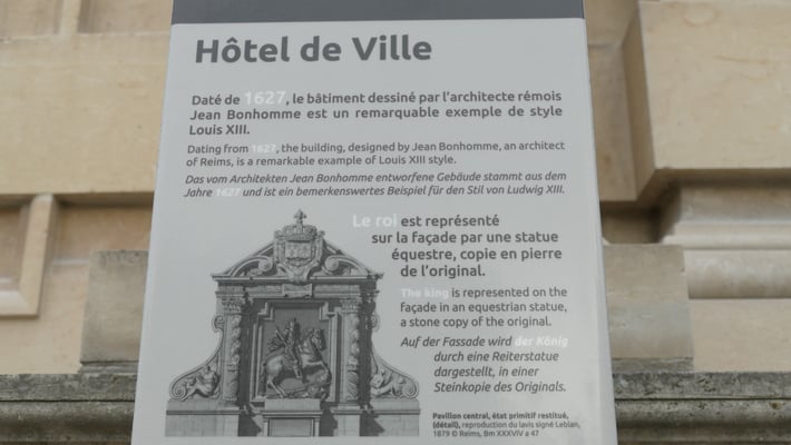 Statue équestre de Louis XIII sur le pavillon central. Blason de Reims sur le balcon.