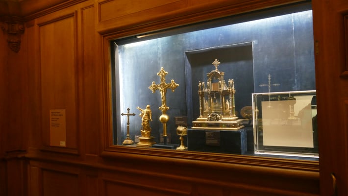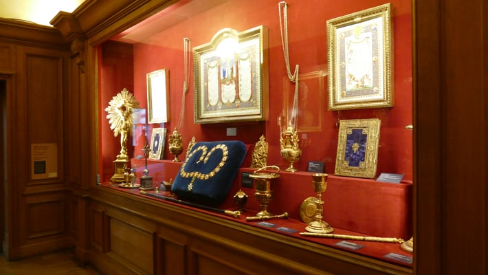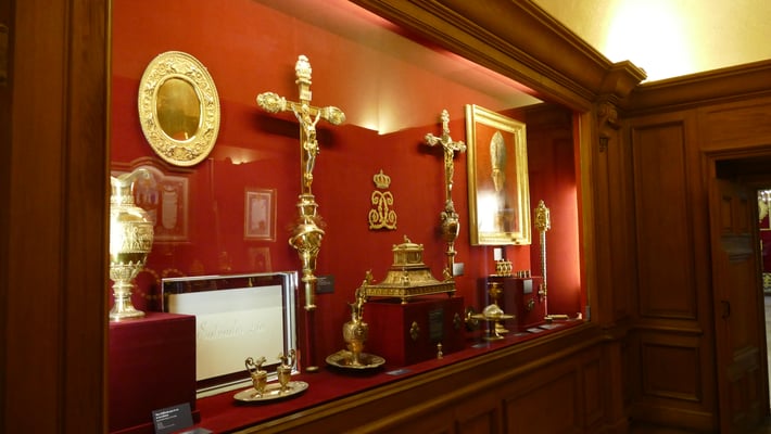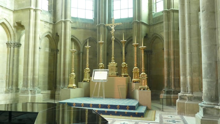 Les pièces les plus remarquables du trésor royal sont le talisman de Charlemagne (IXe siècle) et le calice de saint Remi (XIIe siècle). Le reliquaire de la sainte ampoule renfermerait l'huile d'origine céleste dont était oint le nouveau roi lors de la cérémonie de son sacre.