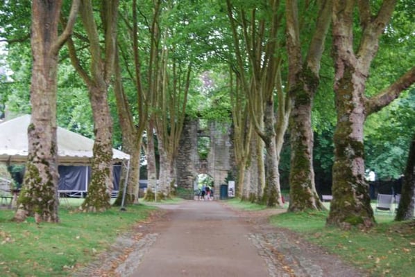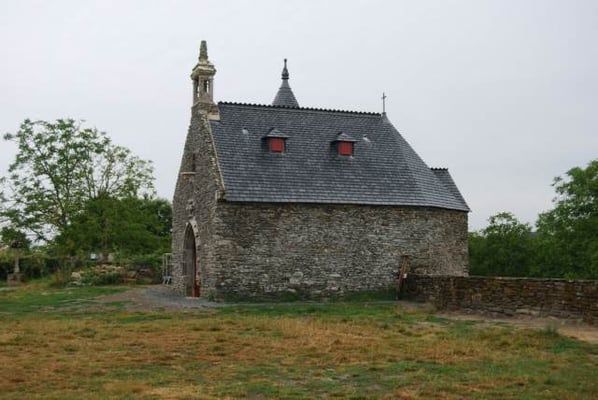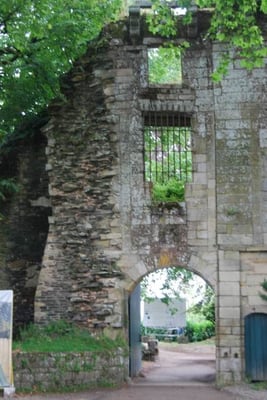 Au bout de l’allée de platanes, ce pan de mur en ruine est ce qui reste du premier château de Rochefort. Dès le 12 ème siècle, le château, puis la cité, sont construits sur cet éperon rocheux, la «Roche Forte» qui donne son nom à la famille. Au 15 ème siècle, c’est sous le règne de Jean IV de Rieux-Rochefort, puis de son fils, Claude 1er, que la cité devient prospère. Jean IV, conseiller du duc de Bretagne, participe à la bataille de St Aubin-du-Cormier, en 1488, au cours de laquelle les Bretons sont vaincus par le roi de France. Celui-ci ordonne la destruction de châteaux bretons, dont celui de Rochefort. À la mort du duc de Bretagne, Jean IV est nommé tuteur d’Anne de Bretagne, et celle-ci lui octroie une dotation de 100 000 écus d’or, avant de devenir Reine de France. Grâce à cette somme, Jean IV reconstruit son château et installe des chanoines dans l’église. Après maintes péripéties, le château est détruit une troisième fois à la fin de la Révolution française. Le domaine est racheté, au début du 20 ème siècle par un peintre américain, Alfred Klots qui transforme les communs en manoir (en continuant le chemin après la ruine). Au décès d’Alfred Klots, son fils, Trafford, hérite du château. À son décès, en 1976, son épouse, Isabel Klots, hérite du château et le revend en 1978 au Conseil Général du Morbihan. Depuis 2013, le château appartient à la commune.