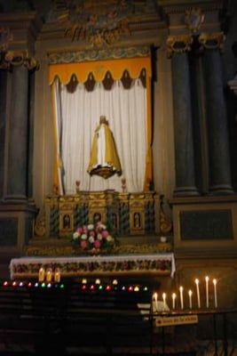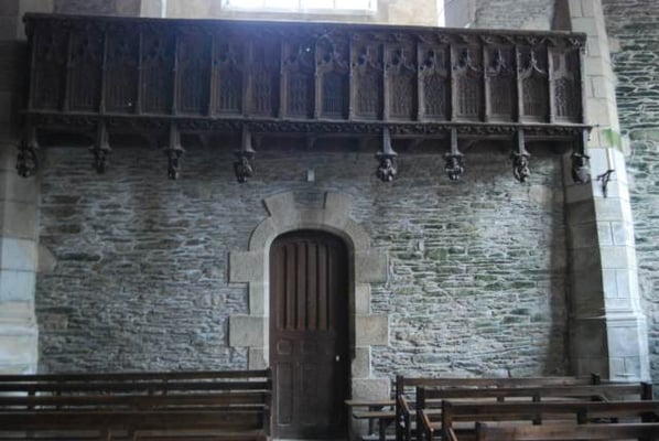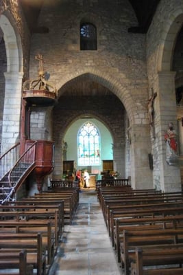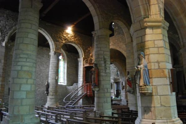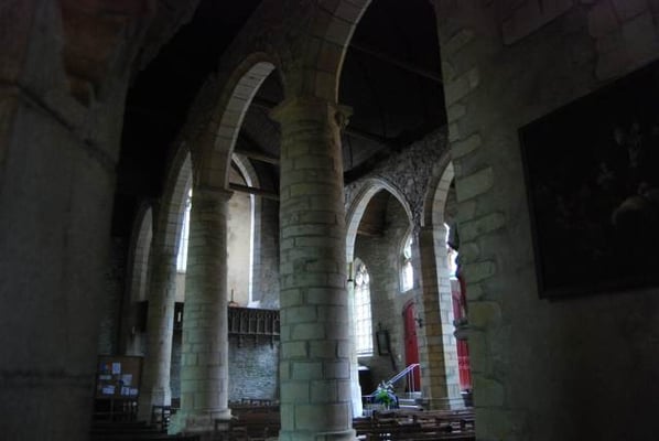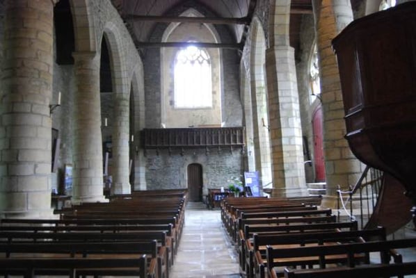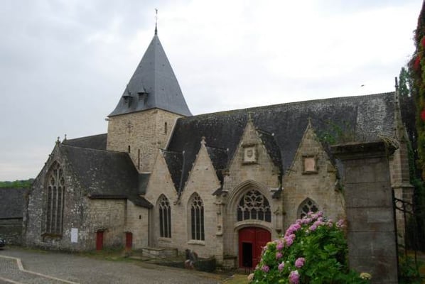 est curieusement située en contrebas de la cité, et bâtie sur un terrain en pente. On raconte qu’au 9ème ou 10ème siècle, au moment des invasions normandes, une statue de la Vierge est cachée dans un tronc d’arbre creux, pour la protéger. Deux siècles plus tard, une bergère retrouve cette statue dans ce même tronc ; il est alors décidé de construire l’église à cet emplacement. On peut voir la représentation de cette histoire sur un des vitraux de l’église. Sur le parvis se dresse un calvaire sculpté ; c’est là également que se trouve le cimetière de Rochefort jusqu’à la moitié du 19 ème siècle. Ce qui frappe dès l’entrée, ce sont les piliers penchés, suite à des glissements de terrain vers le sud, puis vers l’ouest. Des contreforts ont été construits, au sud et à l’ouest, donnant lieu, notamment, à un bas-côté supplémentaire parallèle à la nef. En 1498, Jean IV de Rieux Rochefort fonde un collège de chanoines pour prier pour le repos de l’âme du seigneur et de sa famille. Dans le choeur, on peut encore voir leurs stalles sculptées. En 1925, Rochefort-en Terre devient cité mariale, ce qui donne lieu à la commande de deux nouveaux vitraux : en 1926, le vitrail de l’arrière-choeur représentant la Sainte Famille et en 1927, le vitrail de la bergère découvrant la Vierge dans un tronc d’arbre