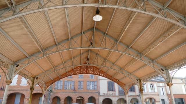 Construite en 1898 à l'emplacement d'un édifice plus ancien, la halle est située face à l'église, sur la place centrale du bourg, la place Nationale, où se tient le marché. C'est un simple parapluie métallique qui repose sur des colonnes de fonte. Elle possède deux rangées de couverts en équerre, « les cornières ».