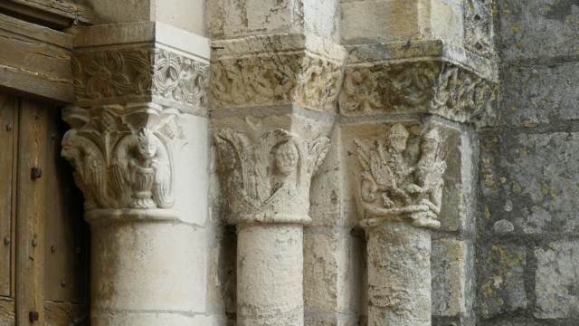 Près du chœur, deux chapiteaux remarquables représentent la tentation d'Adam et d'Ève et des griffons affrontés.