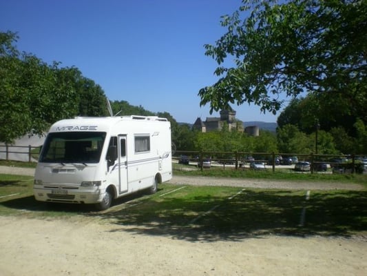 Enfin…je vais pouvoir visiter le château de Castelnaud… (N 44.81541 E 1.14412) «Mimi» monte la côte à son rythme en seconde voire première a certain s endroits pour arriver à proximité du château où il y a une aire de service et des emplacements très agréable avec un décor de rêve. 3 € la journée…donc incluant la nuit les services en plus avec un jeton à prendre au gardien
