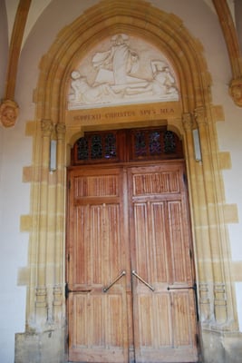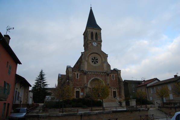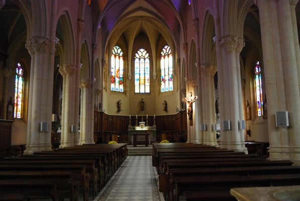 Face à la croix des Enfants, vous trouverez la nouvelle eglise construite en pierres dorées en 1903 par la Fabrique (association qui a recueilli les fonds nécessaires à sa construction). Vous noterez la richesse de ses vitraux.