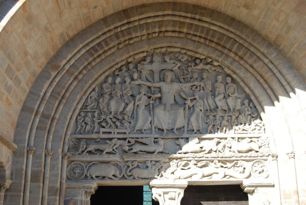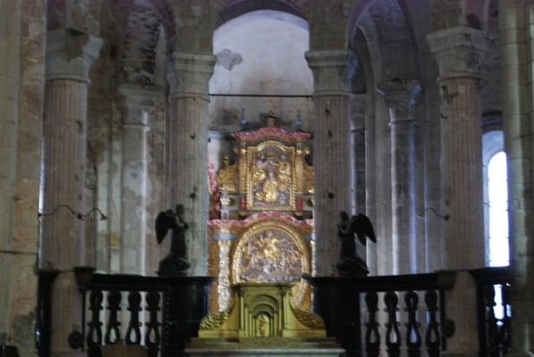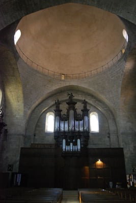 Les trois quarts de la cathédrale furent abattus par les Huguenots en 1577. Les deux premières travées ouest, couvertes de coupoles, ont disparu, ainsi que le clocher-porche