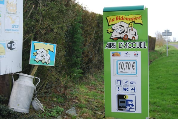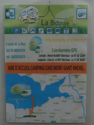 Après la visite j’ai repris le CC pour me garer à la Bidonière (N 48.60383 W 1.47721) a 4 km du site super accueil si vous le désirez ils vous prêtent même des vélos…10 € 70 la nuit avec l’électricité + 3 € si vous voulez de l’eau Ne comptez pas trop sur le Wifi l’émetteur est un peu faiblard…je vais y passer la nuit