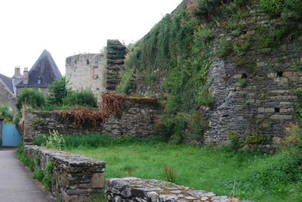 Au bout de l’allée de platanes, ce pan de mur en ruine est ce qui reste du premier château de Rochefort. Dès le 12 ème siècle, le château, puis la cité, sont construits sur cet éperon rocheux, la «Roche Forte» qui donne son nom à la famille. Au 15 ème siècle, c’est sous le règne de Jean IV de Rieux-Rochefort, puis de son fils, Claude 1er, que la cité devient prospère. Jean IV, conseiller du duc de Bretagne, participe à la bataille de St Aubin-du-Cormier, en 1488, au cours de laquelle les Bretons sont vaincus par le roi de France. Celui-ci ordonne la destruction de châteaux bretons, dont celui de Rochefort. À la mort du duc de Bretagne, Jean IV est nommé tuteur d’Anne de Bretagne, et celle-ci lui octroie une dotation de 100 000 écus d’or, avant de devenir Reine de France. Grâce à cette somme, Jean IV reconstruit son château et installe des chanoines dans l’église. Après maintes péripéties, le château est détruit une troisième fois à la fin de la Révolution française. Le domaine est racheté, au début du 20 ème siècle par un peintre américain, Alfred Klots qui transforme les communs en manoir (en continuant le chemin après la ruine). Au décès d’Alfred Klots, son fils, Trafford, hérite du château. À son décès, en 1976, son épouse, Isabel Klots, hérite du château et le revend en 1978 au Conseil Général du Morbihan. Depuis 2013, le château appartient à la commune.