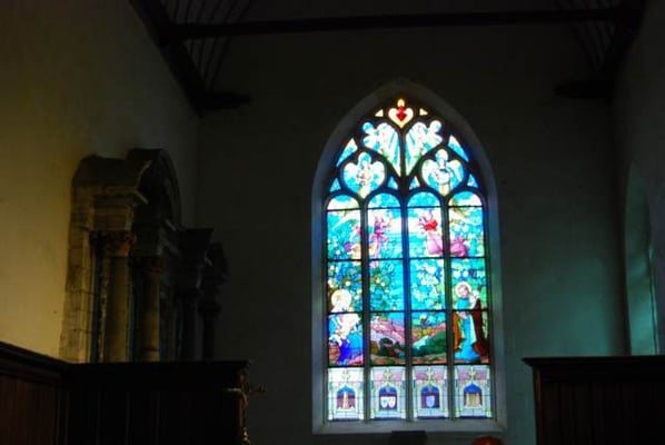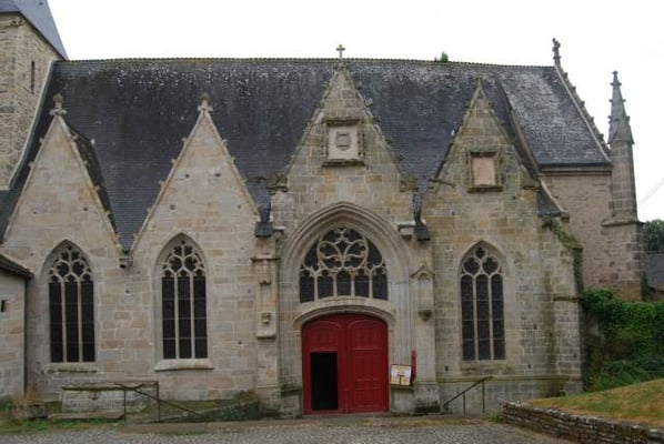 est curieusement située en contrebas de la cité, et bâtie sur un terrain en pente. On raconte qu’au 9ème ou 10ème siècle, au moment des invasions normandes, une statue de la Vierge est cachée dans un tronc d’arbre creux, pour la protéger. Deux siècles plus tard, une bergère retrouve cette statue dans ce même tronc ; il est alors décidé de construire l’église à cet emplacement. On peut voir la représentation de cette histoire sur un des vitraux de l’église. Sur le parvis se dresse un calvaire sculpté ; c’est là également que se trouve le cimetière de Rochefort jusqu’à la moitié du 19 ème siècle. Ce qui frappe dès l’entrée, ce sont les piliers penchés, suite à des glissements de terrain vers le sud, puis vers l’ouest. Des contreforts ont été construits, au sud et à l’ouest, donnant lieu, notamment, à un bas-côté supplémentaire parallèle à la nef. En 1498, Jean IV de Rieux Rochefort fonde un collège de chanoines pour prier pour le repos de l’âme du seigneur et de sa famille. Dans le choeur, on peut encore voir leurs stalles sculptées. En 1925, Rochefort-en Terre devient cité mariale, ce qui donne lieu à la commande de deux nouveaux vitraux : en 1926, le vitrail de l’arrière-choeur représentant la Sainte Famille et en 1927, le vitrail de la bergère découvrant la Vierge dans un tronc d’arbre