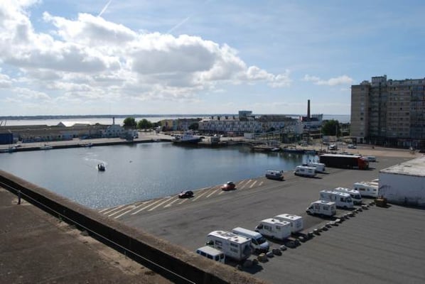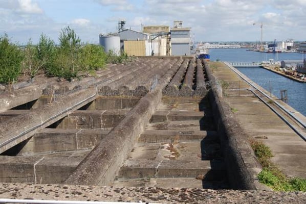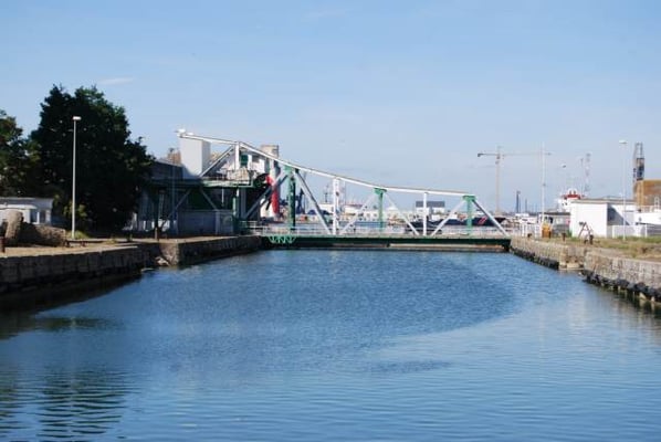 L’usine élévatoire, dont on voit de loin la haute cheminée en briques, n’est plus en service. Pendant plus de 80 ans, de 1911 à 1993, elle remplissait une mission très importante : ses puissantes machines pompaient l’eau dans l’avant-port afin d’assurer en permanence une hauteur d’eau suffisante dans les bassins du port (le niveau baisse naturellement avec l’évaporation et les mouvements d’éclusage).