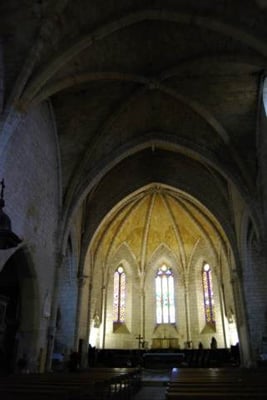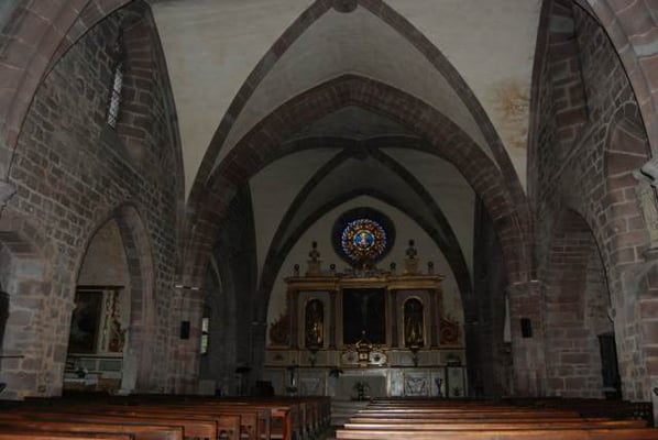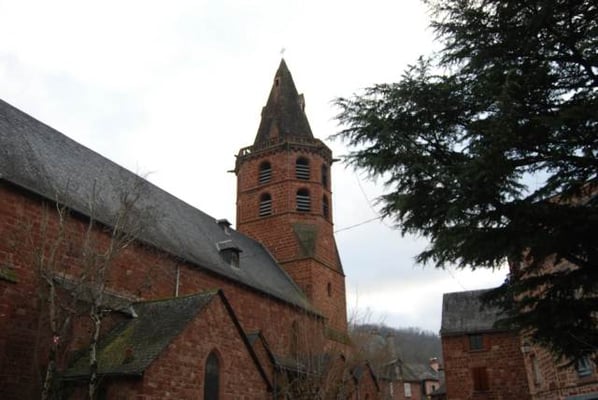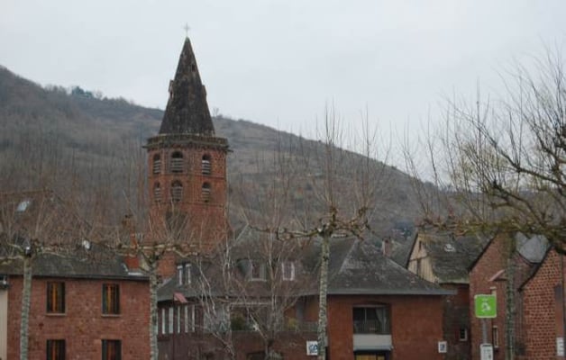 Bâtie à la fin du XIVe siècle, elle est dédiée à Saint-Martial qui a engagé l'évangélisation dans la région vers l'an 60. Elle a été consacrée au XVIe siècle par François d'Estaing, évêque de Rodez. Sa nef monumentale (35X11m) est agrandie par huit chapelles, surmontées d'une tribune reposant sur trois arcades. Une flèche en pierre de taille surmonte le clocher octogonal, dit « toulousain ». La Révolution avait confisqué les cloches du carillon pour en faire des canons. Les trois nouvelles, datent de 1851. Sous le porche sud, un bas-relief sculpté symbolise le Moyen-Age : le lion d'Armagnac terrassé par les lys de France, la victoire de Louis XI sur le dernier grand seigneur féodal.