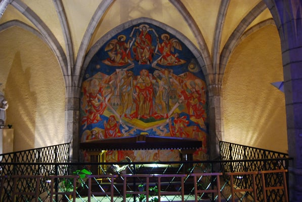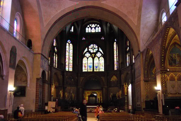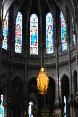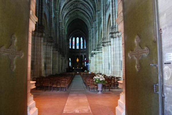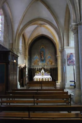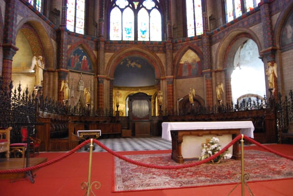 Le coeur compose de 2 travées, suivi d'un sanctuaire à plan circulaire porte sur 6 piliers, le tout entouré d'un déambulatoire sur lequel s'ouvrent 3 chapelles, 2 sacristies et 2 entrées particulières pour le clergé.