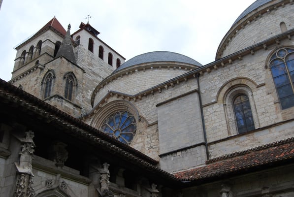 La fondation de la cathédrale Saint-Etienne au cœur de la cité médiévale de Cahors est traditionnellement attribuée à un évêque du VIIe siècle, saint Didier. Le vaste édifice est reconstruit à partir du début du XIIe siècle : le maître-autel est consacré en 1119 par le pape, en même temps qu'un autel spécial consacré à la précieuse relique de la Sainte-Coiffe-du-Christ. Son portail roman au remarquable tympan sculpté s'inscrit dans la lignée de ceux de Saint-Cernin-de-Toulouse, Conques et Moissac. La nef est couverte de deux coupoles, les plus grandes que l'on trouve dans le sud-ouest.