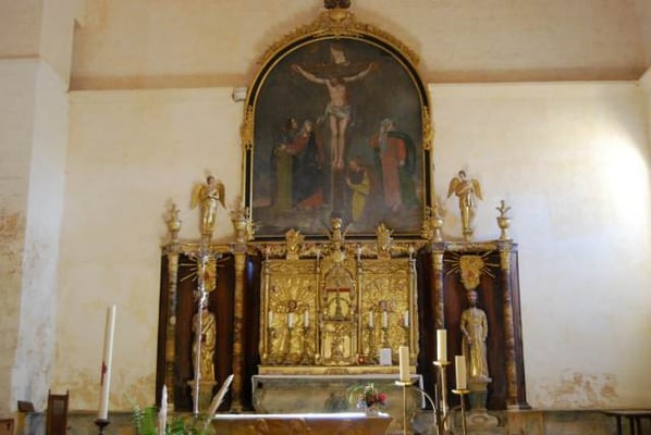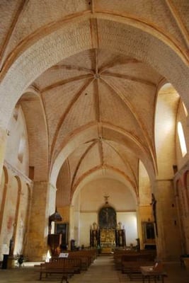 L'intérieur de cette église est monumental, 10 piliers soutiennent la nef. Un puits primitif est situé à l'entrée ce qui permet un accès à l'eau potable en cas de siège. Remarquez quelques vestiges de peintures muralesreprésentant St-Jacques et un christ en majesté.