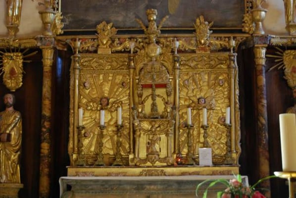 Petit clin d'oeil à Lalinde le village voisin, une des peinture est une imitation de tapisserie représentant St-Front, patron de la paroisse terrassant le Coulobre (dragon) de Lalinde.