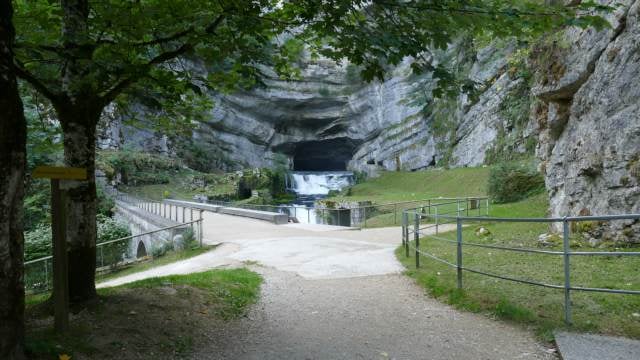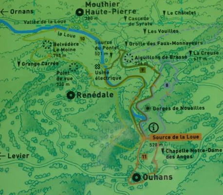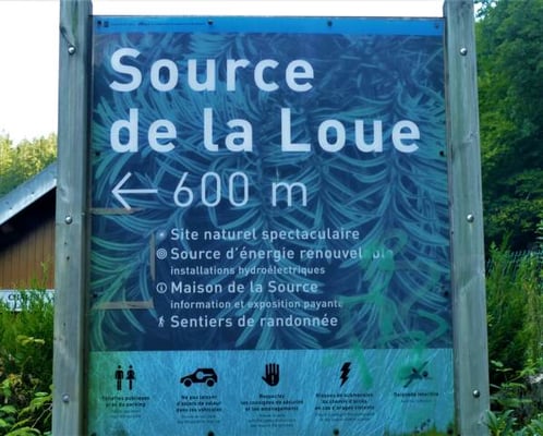Jaillissant d’une caverne large de 60 m et haute de 30 m creusée dans une paroi surplombante de plus de 100 de hauteur, la source de la Loue n’est autre qu’une majestueuse résurgence du Doubs. Magie et grandeur règnent sur cette « reculée » (cirque clos). C’est l’un des sites naturels majeurs du Doubs, aménagé et agrémenté de panneaux didactiques pour mieux comprendre le spectacle naturel qui s’offre au regard. De la source, le sentier permet de descendre les profondes gorges de la Loue, rive gauche, et d'atteindre l'usine électrique puis le village de Mouthier-Haute-Pierre (6km - 2h environ). Accès en voiture par la R.D. 41 conduisant à Ouhans, au départ de la R.N. 67, puis avant Ouhans, prendre la route de la Source ou, pour les piétons, le pittoresque G.R. 595 dominant, rive droite, les Gorges de Noailles (2 km). Site accessible aux personnes à mobilité réduite sur demande au moins une semaine à l'avance à la Communauté de Communes de Montbenoît
