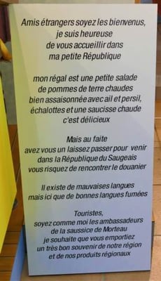A sa présidence et en qualité de chef du protocole, succédant à sa mère Gabrielle Pourchet, Madame Georgette Bertin-pourchet, troisième du nom, reçoit officiellement les personnalités en visite sur les terres de la dite-république et honore de sa présence toutes manifestations sportives et culturelles. Pour parfaire son identité, la République du Saugeais dispose aussi d’un blason, d’un hymne, d’un timbre postal, d’une monnaie, d’un douanier accordant les laissez-passer et, il y a encore peu d’années, d’une langue propre, la Saugette, dont les origines remonteraient à la Guerre de Trente ans au XVIIème siècle.