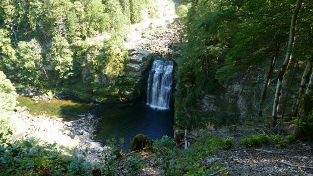Résultat d'un éboulement qui a verrouillé le passage de l’eau, le Saut du Doubs, impétueuse chute d'eau de 27 m, classé Grand Site National, constitue l'apothéose de cette retenue d'eau.