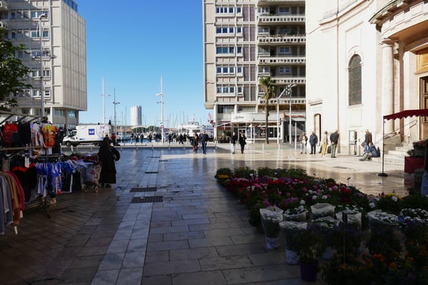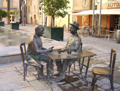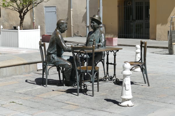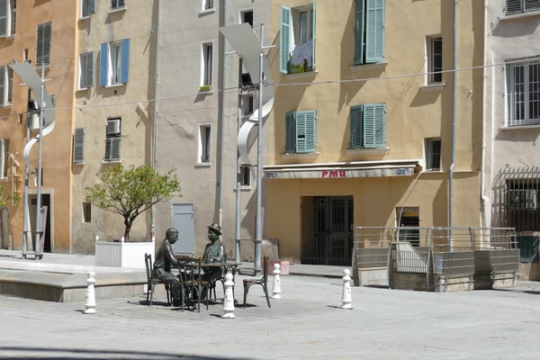 En quittant le port, face à la gare maritime, le visiteur arrive face à la rue commerçante d'Alger. Avant de l'emprunter, allez plutôt directement sur votre droite pour découvrir cette charmante petite place pavée où l'on ne peut s'empêcher de sourire en découvrant, la célèbre partie de cartes entre César (Raimu) et Panisse, immortalisée dans le bronze. Attablés en train de jouer (en taille réelle), on trouve à côté d'eux deux autres sièges, vides, où vous pouvez vous asseoir et partager avec eux un moment surréaliste ! L'expression de vérité dans leurs visages et leurs attitudes. Photographie assurée !