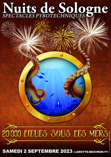 Nos professionnels de la pyrotechnie, du son et de l’éclairage vous émouvront en vous présentant cette œuvre majestueuse et connue de tous qu’est «20 000 LIEUES SOUS LES MERS » de Jules VERNE.