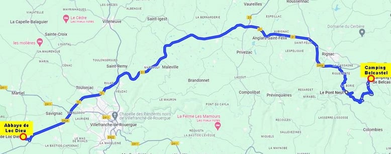 Dans ce pays peu connu sur les chemins de St Jacques : ni massif central, ni toulousain, ni vraiment Quercy, ni vraiment Rouergue, au coin des trois départements de l’Aveyron, du Lot et du Tarn et Garonne, le pays du Quercy-Rouergue cultive donc le paradoxe. Frontière géographique de toujours, frontière religieuse, frontière politique autrefois et du temps de la guerre de Cent ans, frontière encore aujourd’hui. Les Cisterciens s'étant complus dans les frontières, il n’est pas étonnant d’en trouver là. Des bois, un fond de vallée, de l’agriculture, de l’eau. Solitude.