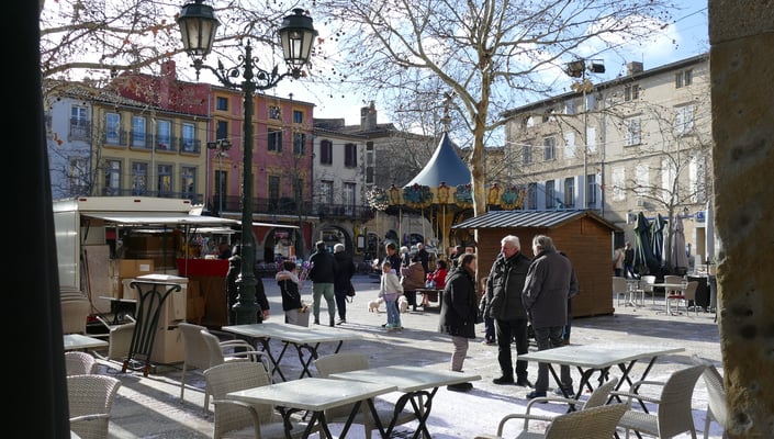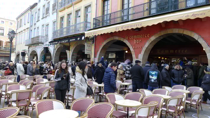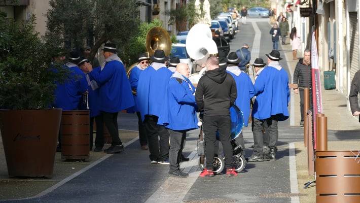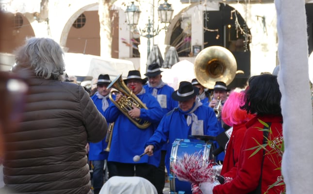 Le carnaval de Limoux sortie 17 heures place de la République, le même samedi d’hiver, la bande las coudénos s’élance sur la place de la république le carnaval de Limoux repart.