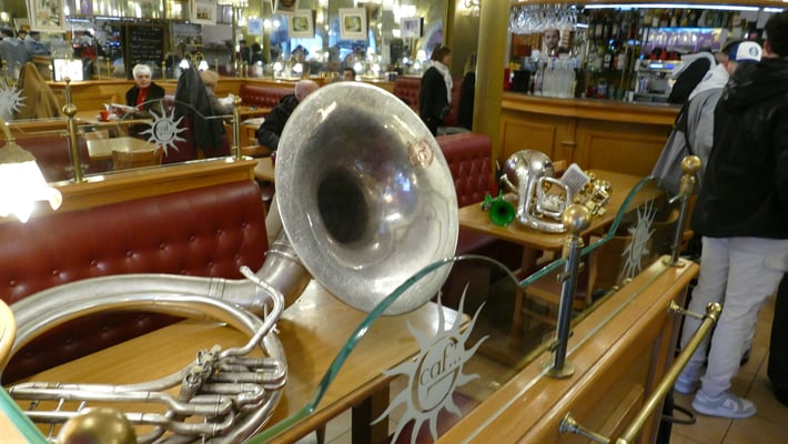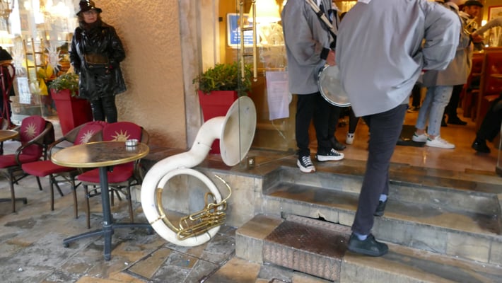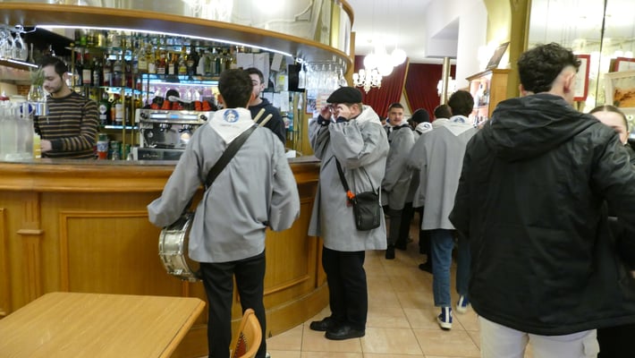 Les pierrots fuchsia et noir sortent à l’instant de leur siège du café « Le TIVOLI ». La foule se presse pour voir passer le carnaval.Pierrots et musiciens se mettent en place. Et rapidement, s’égrènent les premières notes des « airs de l’après-midi .»