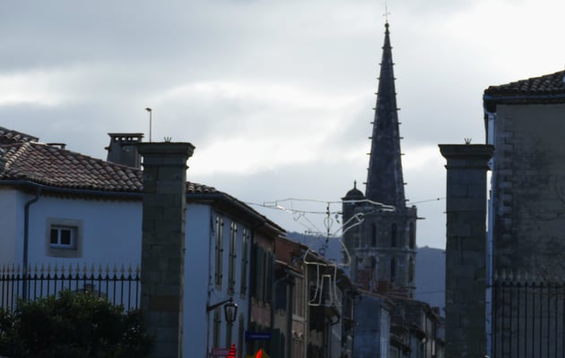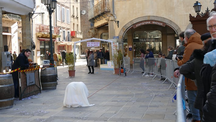 La carabène d’une main de l’autre une poignée de confettis, la gestuelle démarre sous les arcades du centre ville de Limoux
