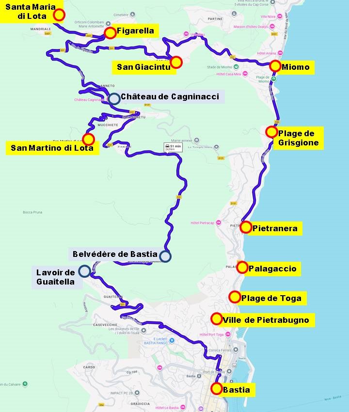 Nichée dans un véritable « poumon vert » au nord de l’agglomération de Bastia, cette commune est dispersée entre onze hameaux disséminés sur les collines et sa façade maritime connue pour les plages de galets de Grisgione et de pietranera.