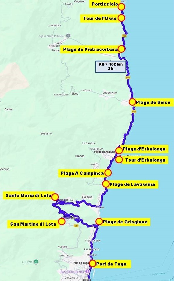 Pour vous rendre sur cette plage depuis le centre de Bastia, prendre la direction du Cap Corse sur la D80A. Passez devant le port de Toga, la plage est située à 150 mètres après ce dernier (panneau indiquant l’accès à la mer sur la droite avant la station-service). Par contre, il est très difficile de stationner (parking sur la port de Toga).