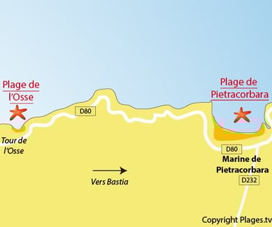 A la sortie de Pietracorbara en allant vers le nord du Cap Corse, on trouve une petite crique au pied de la tour génoise de l’Osse (à la limite de Cagnano) entourée de rochers lisses. Cette plage est peu connue et fréquentée en grande partie par des locaux. Entourée par une végétation dense, on y trouve de l’ombre et quelques bancs de sable. L’eau est très claire, idéal pour admirer les fonds sous-marin.