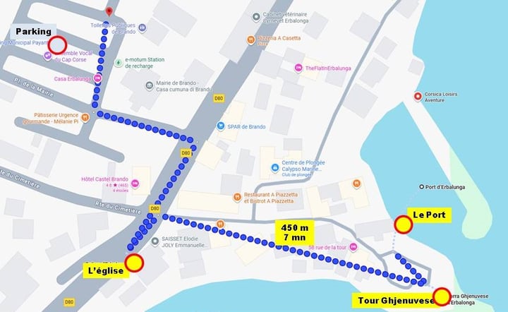 A l'intérieur du village d'ERBALUNGA (ancienne tour ronde illuminée la nuit) il y a ici deux options : A) asphalté sur une pente au-dessus de la route D80, mais accès au quartier résidentiel ; B) gravier plat au niveau de la route D80, avec quelques ombres (choix bas de zone après écopoint, pour laisser des places aux usagers du restaurant ; il n'y a pas de panneau indiquant un parking réservé au restaurant). Accès : en voiture S-N, tourner à gauche 200m après supermarché.