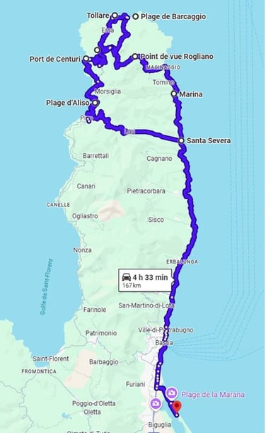Tout au bout du cap, face à la mer et au continent, il est une partie de la Corse qu’on ne découvre qu’en s'y plongeant.... Deux marines auxquelles on accède par une route, qui seule, sinueuse, serpente dans le maquis, telle une rivière, depuis le sommet de la montagne jusqu’à la mer Barcaggio et Tollare.