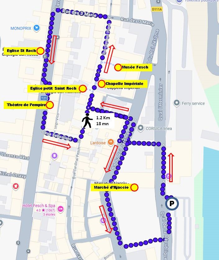 Tracée au début du XIXe siècle, la place Foch (dite des Palmiers) réunit la vieille ville à ce qui était le faubourg (actuelle rue Fesch) .En haut de la place se trouve la statue de Napoléon en consul romain, œuvre du sculpteur romain Massimiliano Laboureur. A gauche de la rue Bonaparte, dans une niche, la statue de la Vierge de la Miséricorde (A Madonuccia) protectrice d’Ajaccio, fêtée le 18 mars.