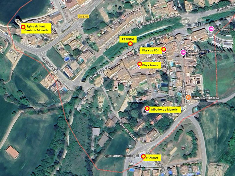 Le village est également construit à l'intérieur d'un ancien château dont il ne reste que les murs. Et, comme si cela ne suffisait pas, la rivière Rissec, où se trouvaient les moulins susmentionnés, traverse tout le village divisant Monells en deux parties clairement différenciées.