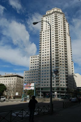 La place possède une fontaine avec un étang et des jardins. Elle est encadrée par deux bâtiments emblématiques de la ville : la Torre de Madrid (Tour de Madrid) et l’Edificio España (l'immeuble Espagne) qui constituent l'un des ensembles architecturaux les plus intéressants de la capitale.