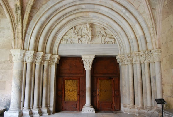 La cathédrale, dédiée à sainte Thècle, est construite en 1171. Sa façade est romane avec un portail gothique, orné de sculptures du Christ du Jugement dernier, de vingt-trois prophètes de l'Ancien Testament et apôtres, et de la Vierge à l'Enfant. Le haut de la façade demeure incomplet, à cause de la crise due à la grande peste de 1348. On trouve aussi un sarcophage paléochrétien du ive siècle. La grande rosaceévoque celle de Notre-Dame de Paris.