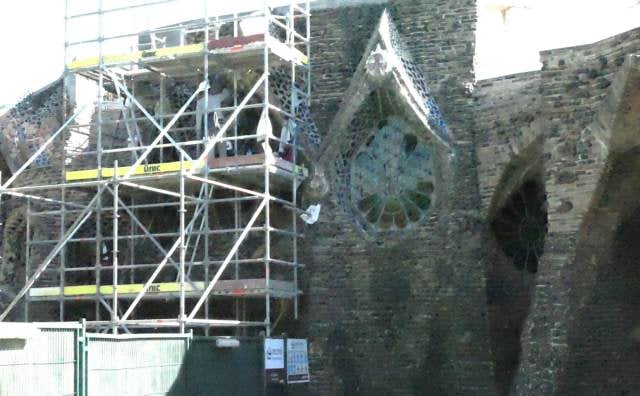 À ce moment-là, on avait fini la chapelle inférieure, connue comme la crypte, et le porche annexe, espace sur lequel devait être construit le perron d’accès au temple. Sur le plan supérieur devait être construite la nef principale, qui serait complétée par plusieurs tours et une tour-lanterne centrale. Toutefois, seuls les linteaux du portail furent réalisés.