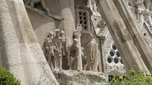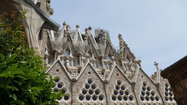 De l'extérieur, la Sagrada Família offre ses tours impressionnantes et les trois façades qui représentent chacune différents moments de la vie de Jésus : la Nativité, la Passion et la Gloire. Un aspect extérieur grandiose qui est encore loin d'être terminé.