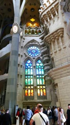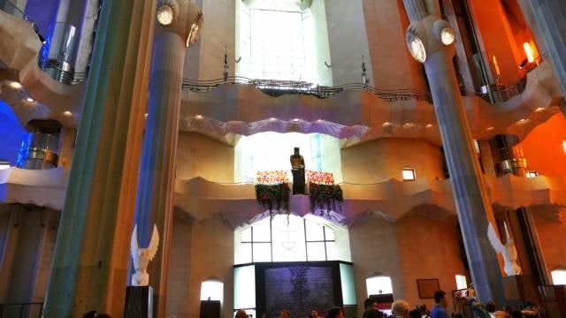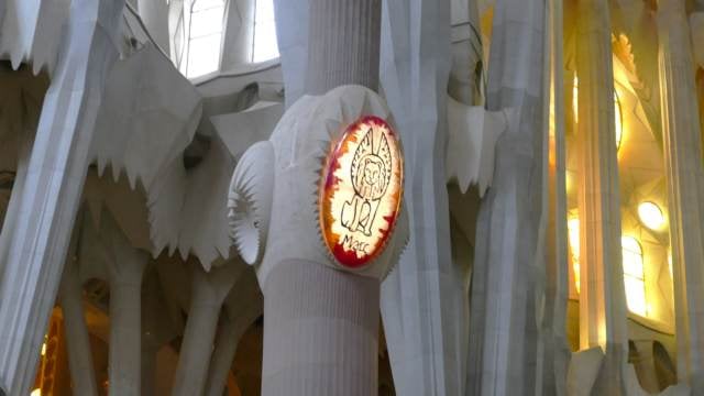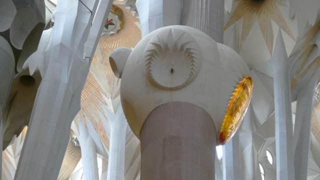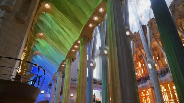 La Sagrada Família offre à l'intérieur ses impressionnants piliers, construits dans des matériaux de différentes duretés. On y trouve en effet plusieurs gros piliers en porphyre rougeâtre, une roche volcanique, des piliers plus fins et bleuâtres en basalte et d'autres en granite, sur lesquels se reflète la lumière extérieure.