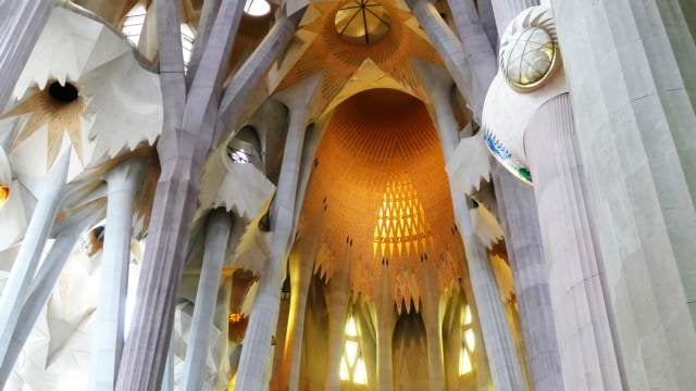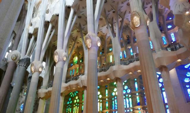 L’édifice a la forme d’une basilique à croix latine, avec cinq nefs, le croisement de trois nefs et une abside dotée d’un déambulatoire très large qui possède sept chapelles polygonales et deux escaliers en colimaçon qui montent dans les chœurs où sont placés les chanteurs. Pour la conception des structures, Gaudí s’est inspiré des formes de la nature et a créé des colonnes en forme de troncs d’arbres qui transforment l’intérieur de la basilique en une immense forêt de pierre. On y trouve également de nombreuses références religieuses dans toute sorte de détails. Pour libérer les plafonds du poids de l’édifice et éclairer l’espace, l’architecte a situé des lucarnes ou claire-voies dans les espaces vides situés entre les colonnes, conçues à partir d’hyperboloïdes, construites avec des pièces de verre dorées et vertes pour laisser entrer la lumière du soleil.