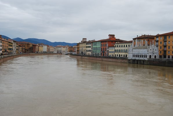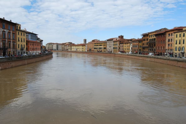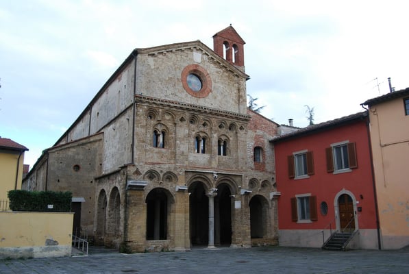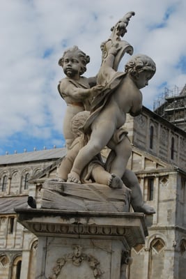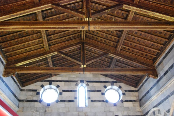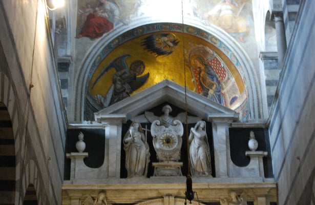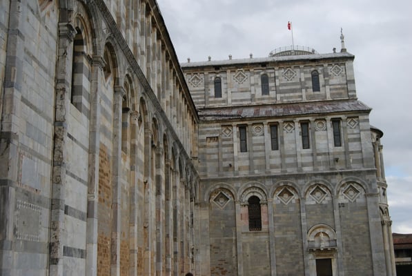 · Le Duomo (la cathédrale de Pise) : commencée en 1064 et achevée au milieu du XIIe siècle, elle est caractéristique du style roman pisan. L’extérieur est recouvert de marbre vert et blanc et la façade est remarquable par ses quatre rangées d’arcatures aveugles. L’intérieur est composé d’une nef à cinq vaisseaux. La voûte de l’abside est décorée d’une grande mosaïque du XIVe siècle représentant un Christ Pantocrator. Autre élément remarquable, la chaire réalisée par Giovanni Pisano entre 1302 et 1311.